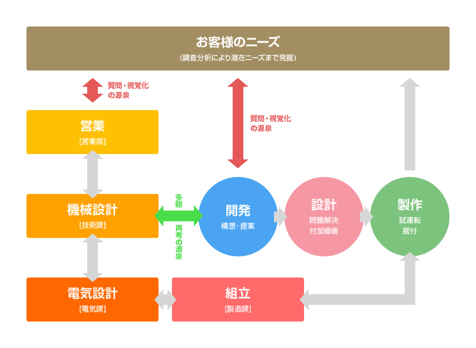 「設計・開発」で大切にしている事、それは「対話」の中に見いだす「質問・視覚化」「多眼・再考」のプロセス、そして「長年のノウハウ、技術」です。