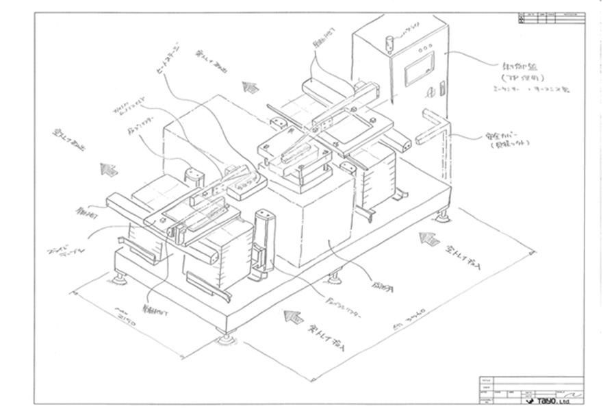 装置の構想を早い段階でお客様に説明するときに斜方眼紙等で技術者が立体的に装置外観を描く視覚化の手法です。