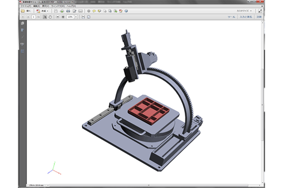 360°視覚可能な「3D 装置データ」を作成し、ご説明致します。「ラフスケッチ」と比べ、装置構想 がある程度絞り込まれた段階でご確認頂ける視覚化です。 最大の特徴は、装置がどのように動作するかどうかが、データ上で確認出来る事。装置が全く出来上 がっていない最初の段階で、動きまで確認出る事はお客様にとっても最大のメリットです。