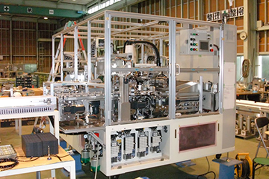 マイクロチップの製作工程後、パレットに収まったチップを取出し、新たな別のパレットに納め変える自動搬送移載機。人手から自動化へコストダウンに効果を出した。