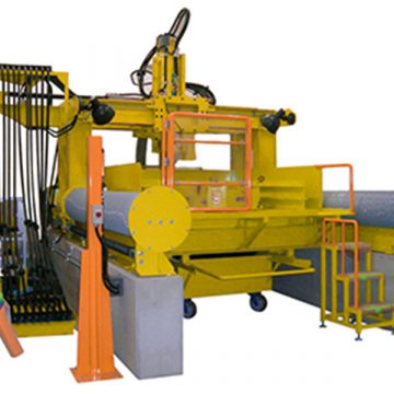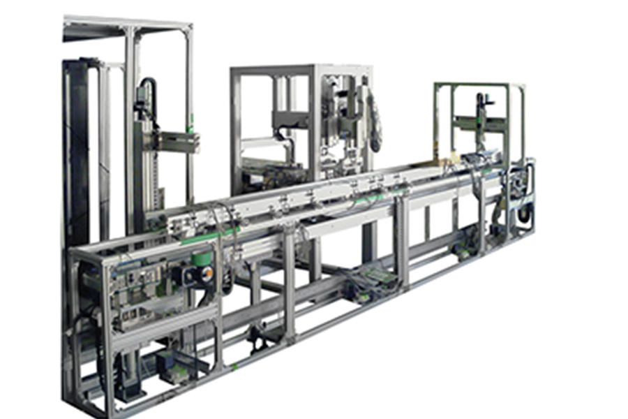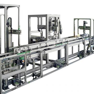 マイクロチップの製作工程後、パレットに収まったチップを取出し、新たな別のパレットに納め変える自動搬送移載機。