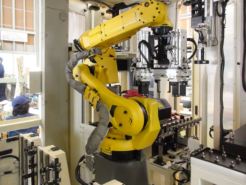 ロボットでヘッド部分を掴み、自動溶接ボックスへ装填、形状の違う約40品目のヘッドを掴み分けるようプログラム。