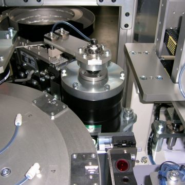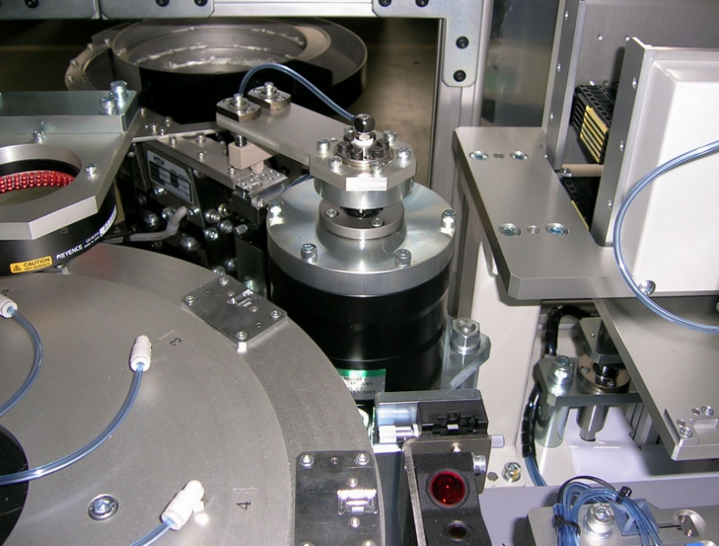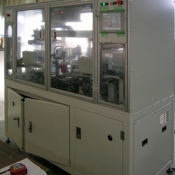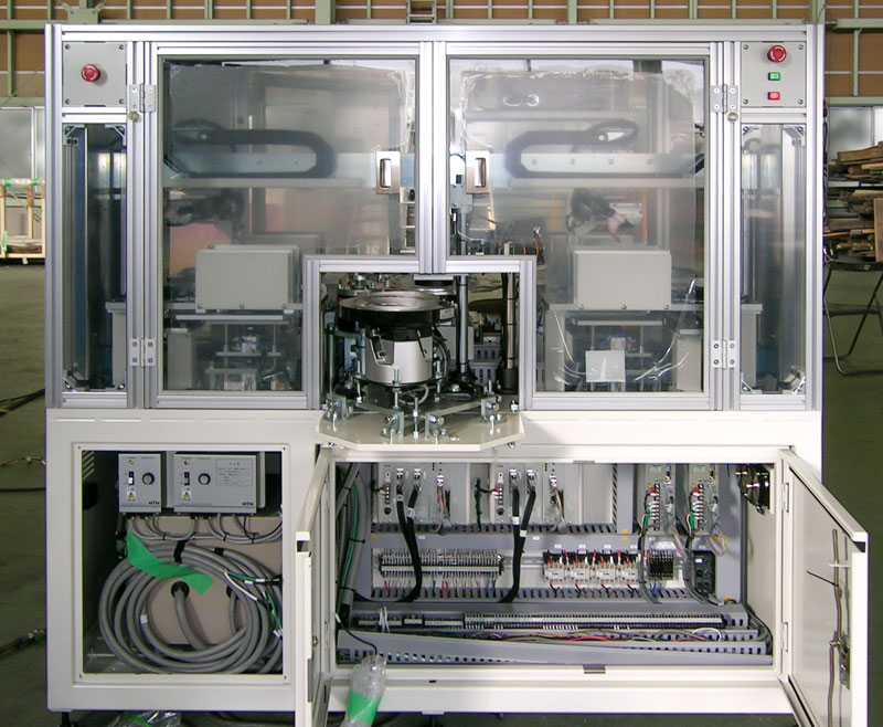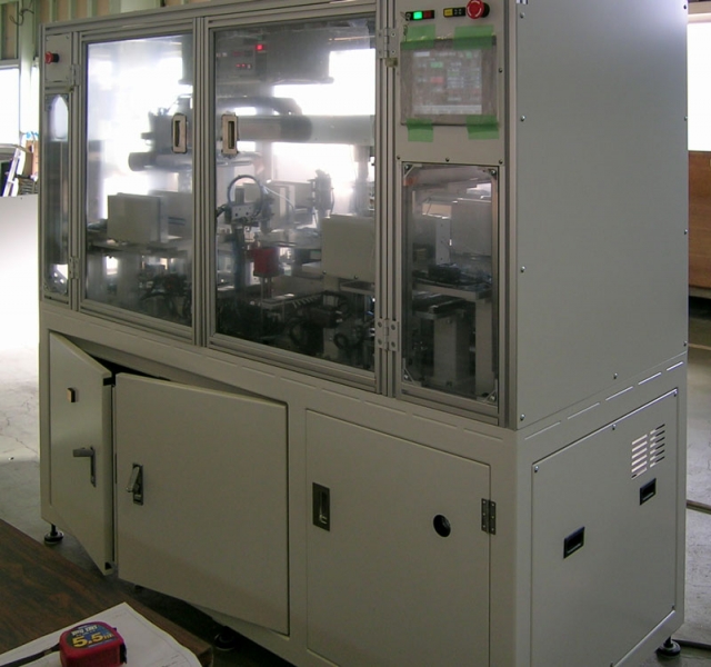 電子機器、赤外線受信部の微少な樹脂、アルミカバー2点からなる部品を接着材を塗布してアルミカバーをかぶせる自動装置、組立だけでなく検査、パレット収納まで行う装置。