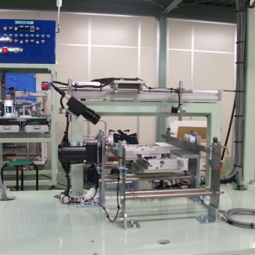 製品である円筒状スポンジを特殊ライトを当てながらカメラにて検査し、適性品質かを自動で判定する装置。